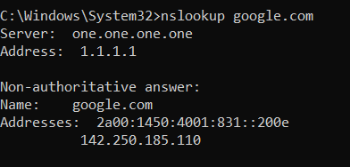 In this case, google.com correctly resolves to both IPv4 and IPv6 addresses, confirming that the DNS resolution works as expected.