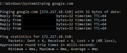 In this case, the connection to Google is successful, with 0% packet loss and extremely low latency.